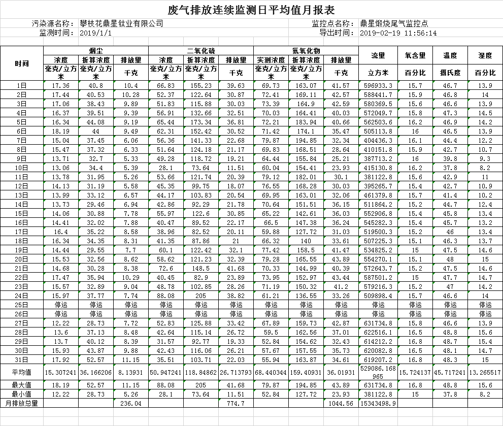 2019年1月煅烧尾气排放连续监测日平均值月报表