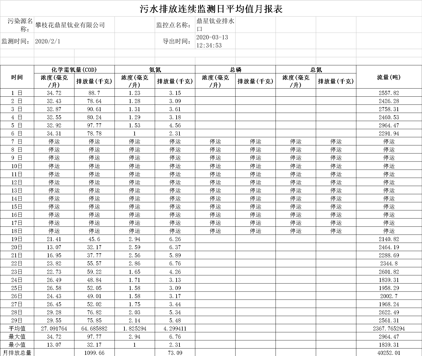 2020年02月污水排放连续监测日平均值月报表