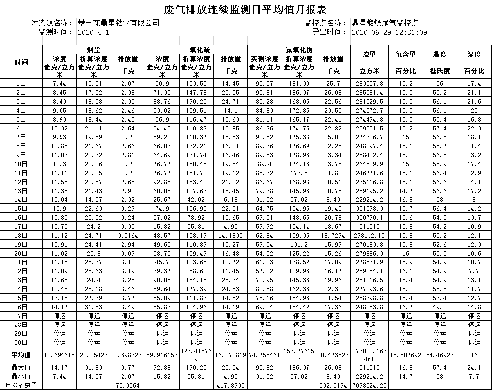 2020年04月煅烧尾气排放连续监测日平均值月报表