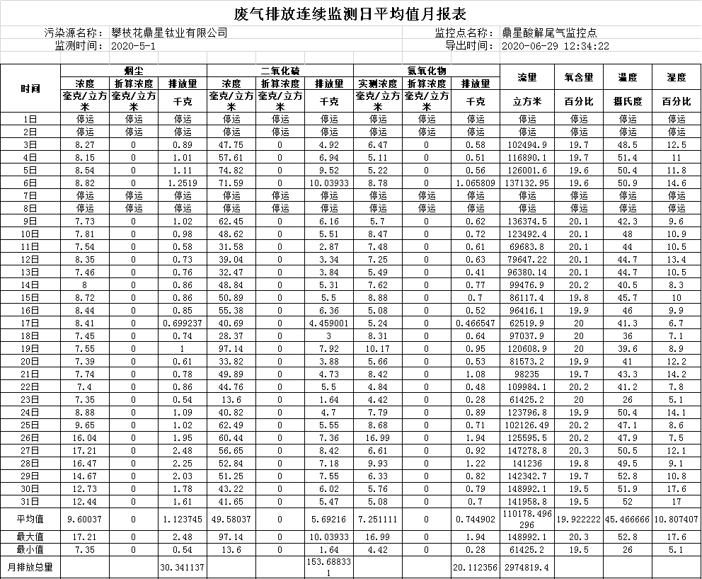 2020年05月酸解尾气排放连续监测日平均值月报表