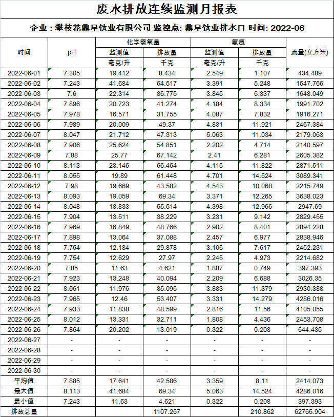 2022年6月废水排放连续监测月报表