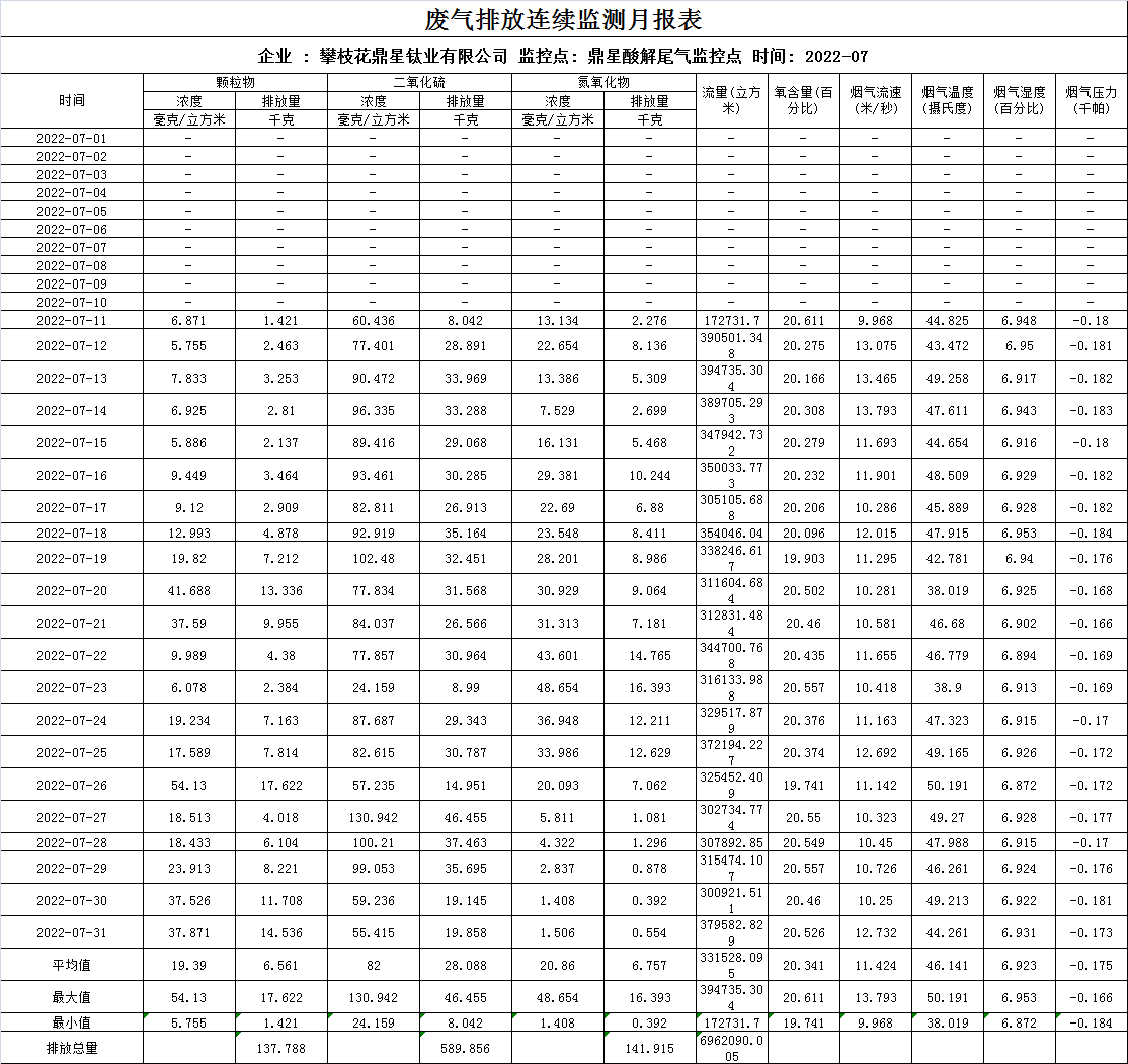 2022年7月酸解废气排放连续监测月报